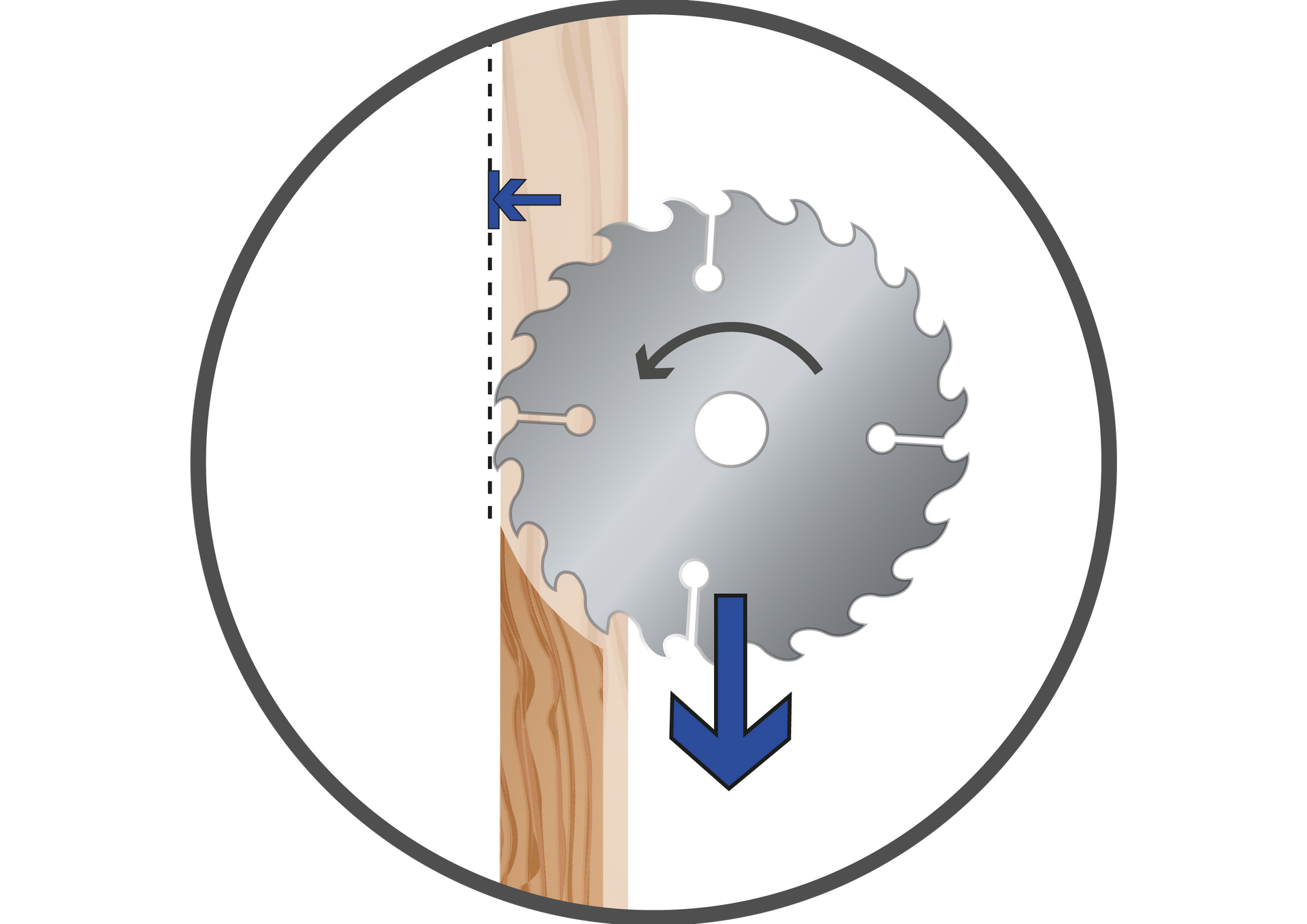 Le premier passage se fait en faible profondeur (Profondeur de première passe = 2mm). La coupe est réalisée en « avalant » (en coupe verticale : du bas vers le haut du panneau / en coupe horizontale : de la droite vers la gauche). Cette coupe créé une première incision sans éclat.